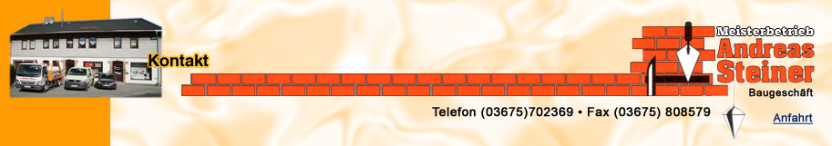 Nehmen Sie Kontakt mit uns aufBaugeschäft Andreas SteinerBettelhecker Strasse 2a96515 SonnebergTelefon (03675) 70 23 69Mobil(0172) 7 60 19 23Telefax(03675) 80 85 79E-Mailinfo@steiner-bau.de